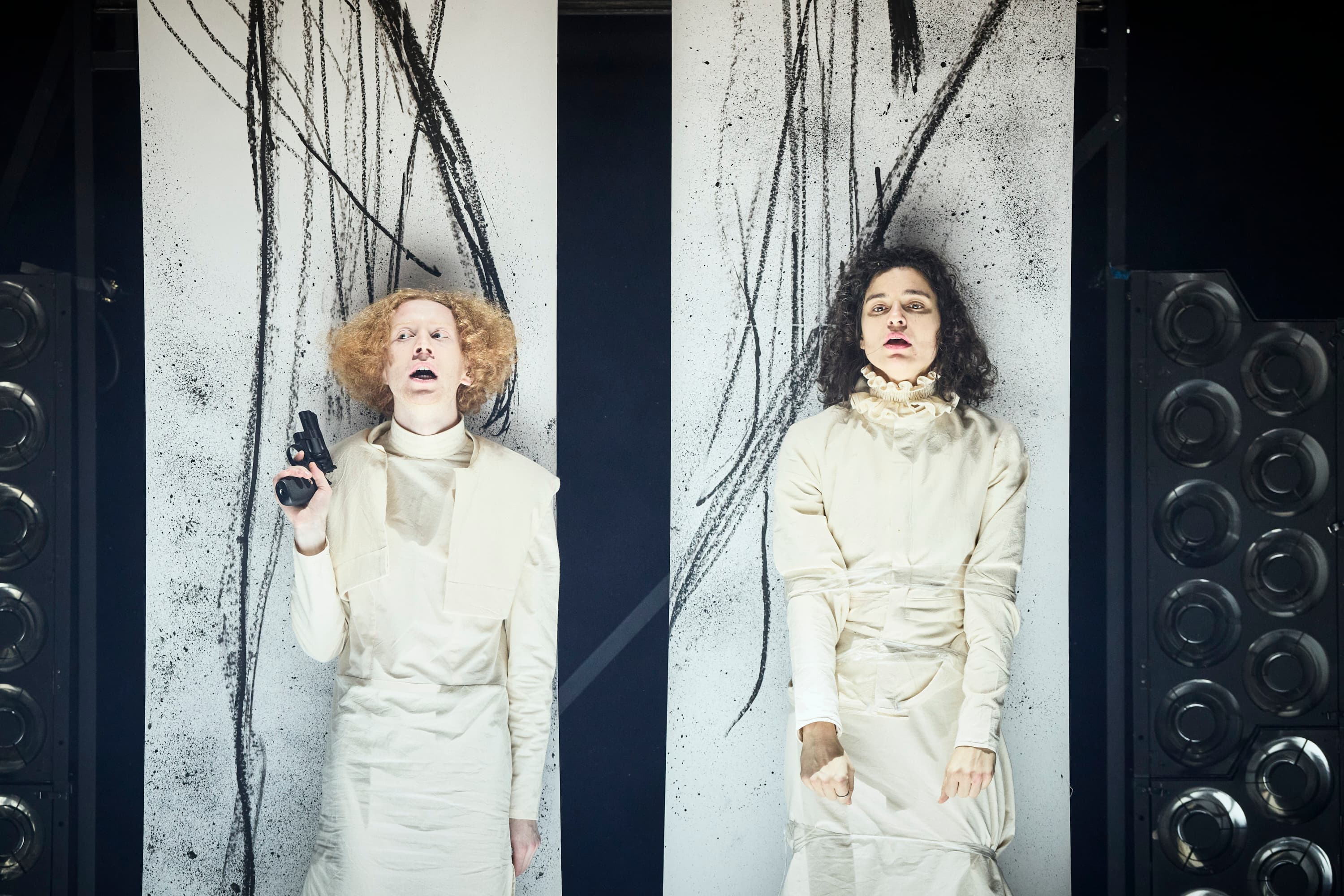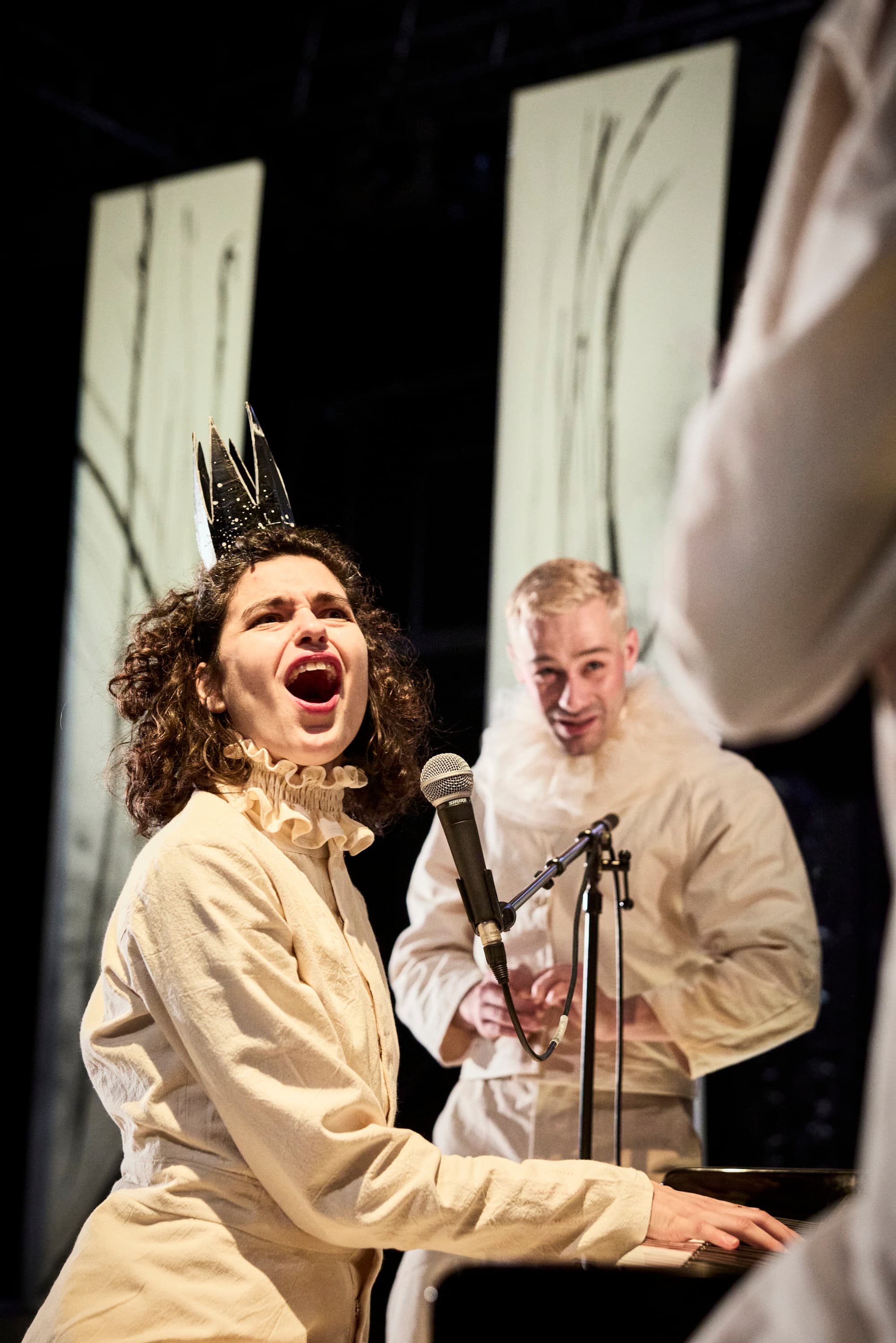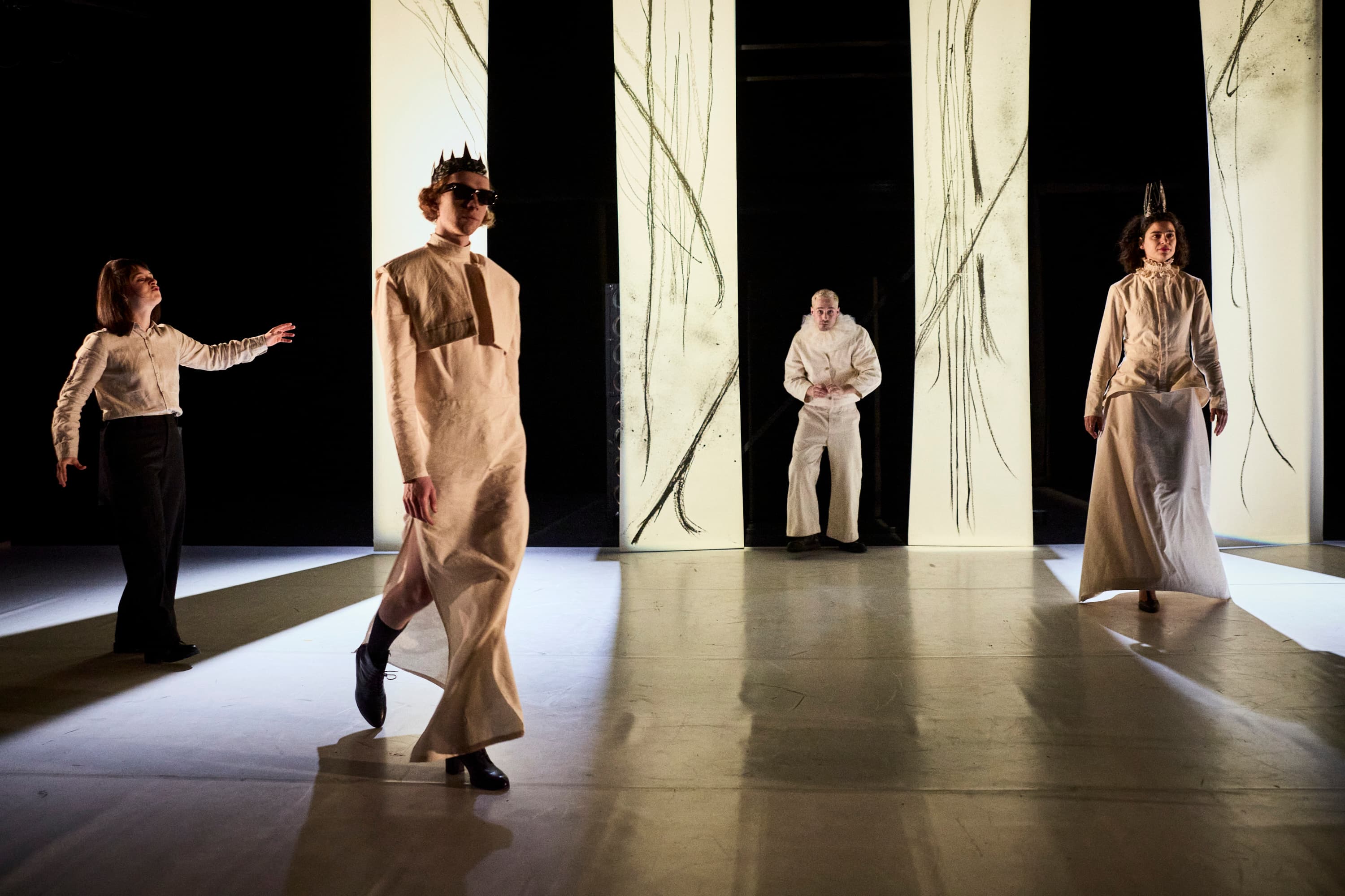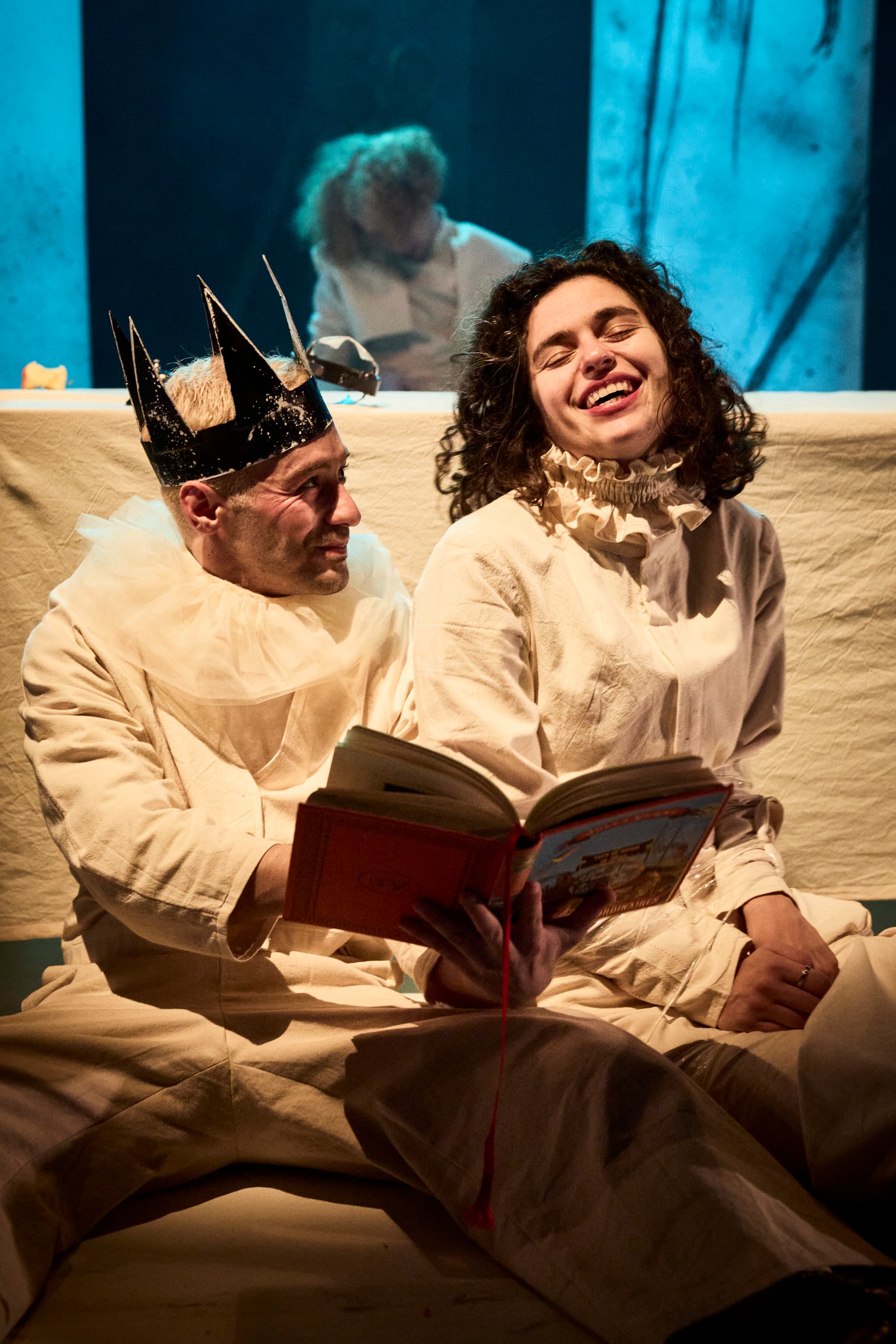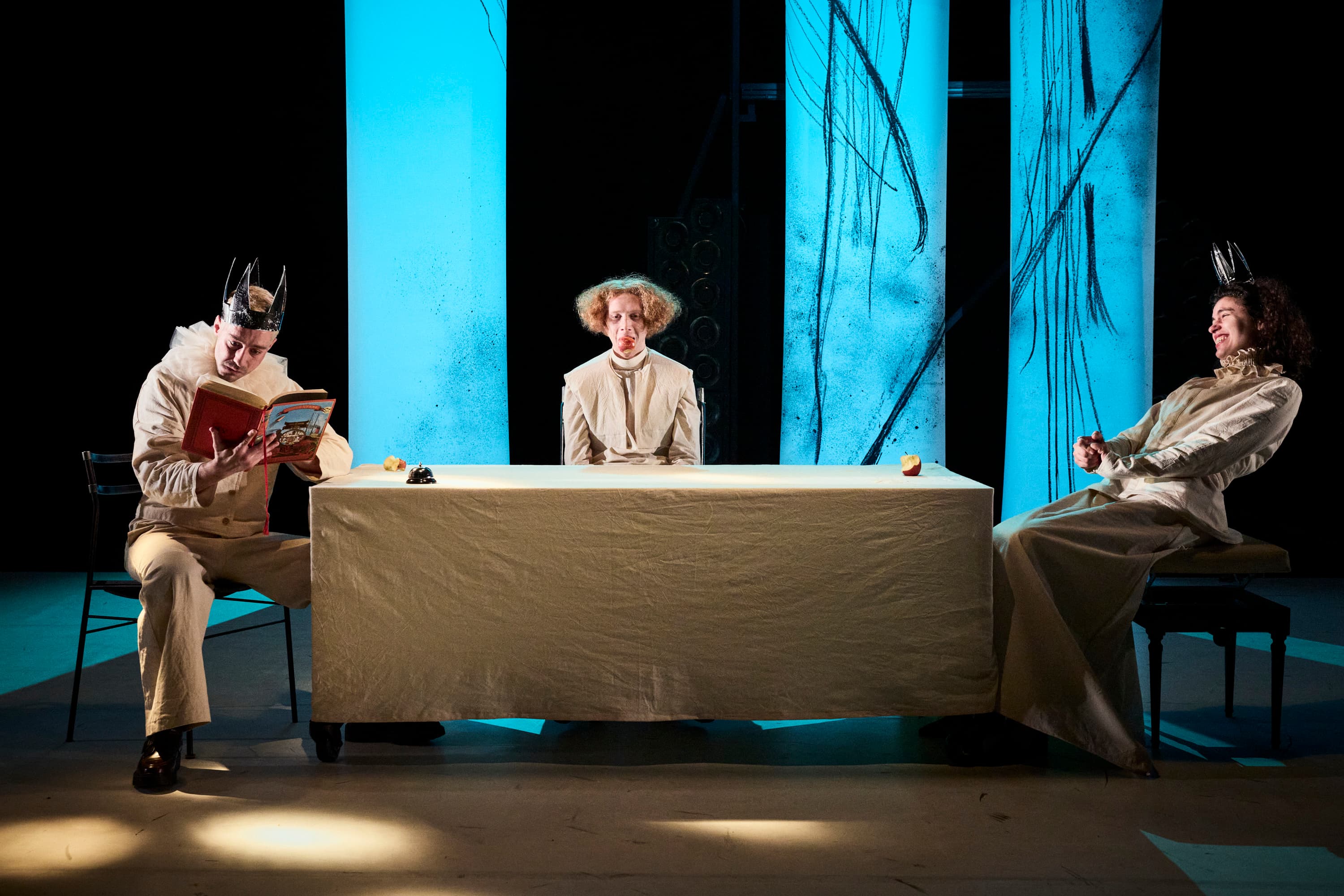 Avec Le Roi, la Reine et le Bouffon, elle joue malicieusement avec les codes du conte, tout autant qu’avec ceux du drame (Shakespeare n’est pas très loin), mettant en scène un trio de figures sarcastiques, qui explore les rouages de la violence et de son renversement. Farce cruelle et stylisée, la pièce suit l’enfermement de trois personnages, forcés à l’isolement dans un triste royaume. Les conséquences fâcheuses de ce huis clos ne tarderont pas à se faire sentir… Une fable bouffonne qui s’avère aussi une formidable et perspicace anatomie de la domination !